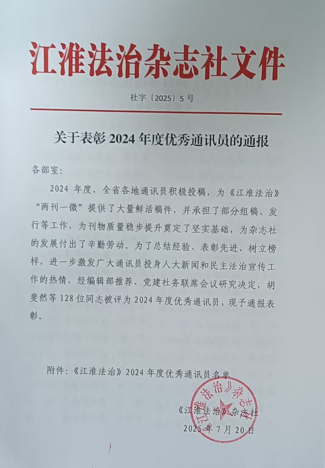 喜报!宜秀区一名人大干部荣获《江淮法治》2024年度“优秀通讯员”称号